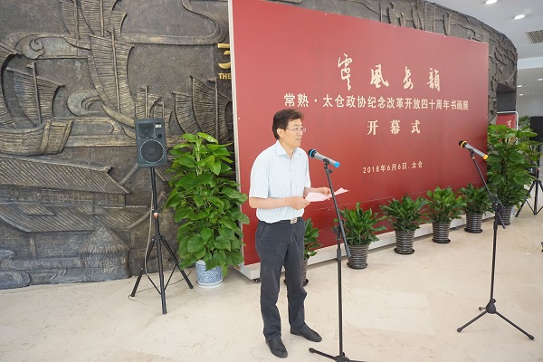 邱震德主席在致辞中说,同处江南福地的常熟和太仓,自古以来就是书画艺术家生活和创作的理想之地,文化艺术领域流派纷呈、名人辈出。改革开放以来,两地政协文化艺术界委员引领时代、贴近生活、勤耕不辍,创作了大量优秀书画作品,为传承和弘扬地域文化、扩大城市影响、凝聚发展合力作出了积极贡献。他表示,希望此次书画展能为增强民族文化自信、促进两地文化繁荣作出新的更大贡献。